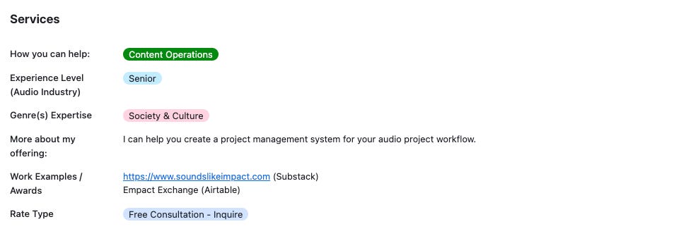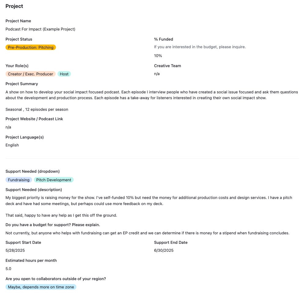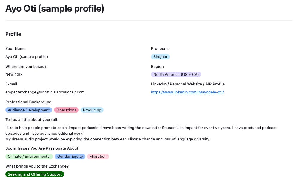 Empact Exchange is free to use, but we could use your support to improve and scale. Right now, the platform is running on a basic version of Airtable that places limits on the automation and views that can be leveraged. If you want to help cover the costs, please consider becoming a paid subscriber of Sounds Like Impact, making a one-time donation, or placing an ad in the newsletter. Thank you!