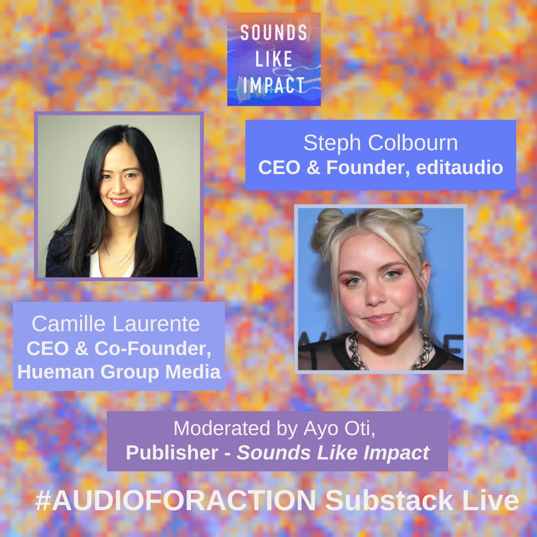Tuesday, March 31st, from 3-4 pm ET / 12-1 pm PT, I’ll be speaking with Camille Laurente, CEO & Co-Founder of Hueman Group Media, and Steph Colbourn, CEO & Founder of editaudio. Both audio companies are mission-driven, and we’ll talk about what that means and how they are navigating today’s audio and journalism landscape.